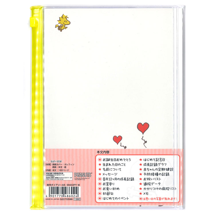仕様内容 【サイズ】W162×H211×D9mm A5 【ページ】160ページ 【表 紙】カバー/オレフィン 表紙・本文/紙 【仕 様】ポケット付き透明カバー(ペンホルダー付き) 【内 容】週間日記/育児ダイアリーの使い方/お誕生おめでとう/生まれ日のこと/名前について/ママ・パパからのメッセージ/各月12ヵ月の記録/お宮参り/お食い初め/初節句/その他のお祝い/1歳のお誕生おめでとう/初めて記念日/赤ちゃんの定期健診/予防接種の記録/メモ 【生産国】日本 特記事項画像はあくまでも商品イメージになります。